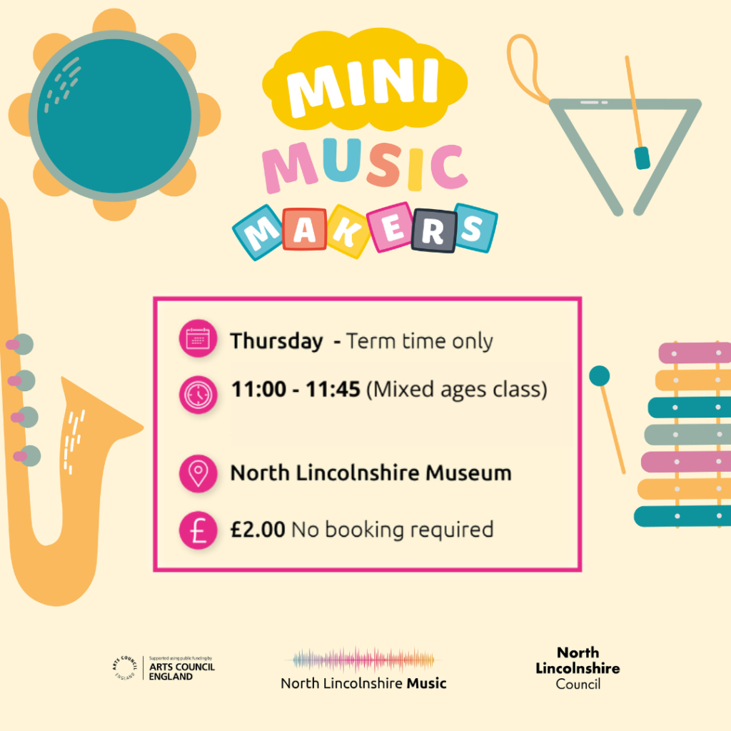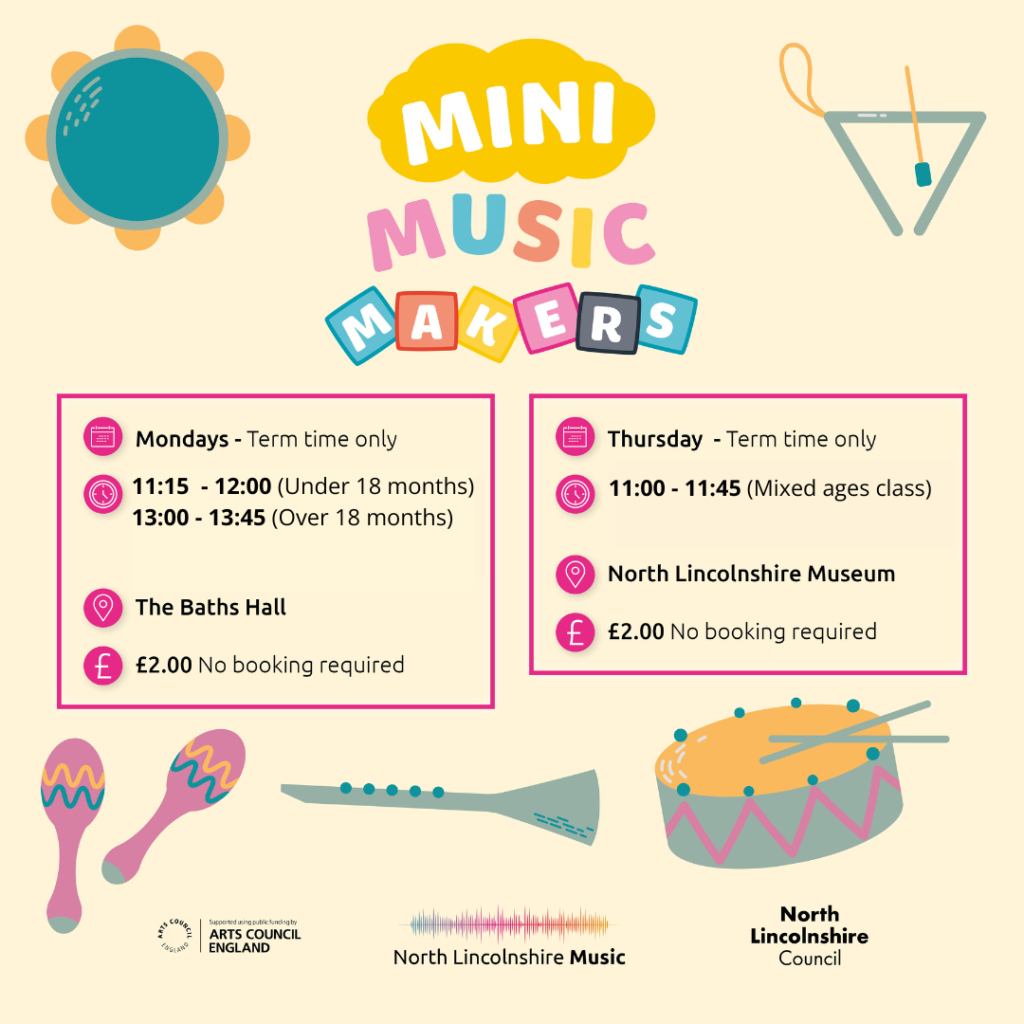 Mini Music Makers Explore sounds, instruments and voices through activities games and songs! Join North Lincolnshire Music every Thursday during term time. From now on it’s one class at 11am. Come on a musical adventure… a new theme every week! No need to prebook, just turn up and pay at reception. £2 admits a child and their parent/guardian. Numbers are limited to 24 in total, so don’t be late.