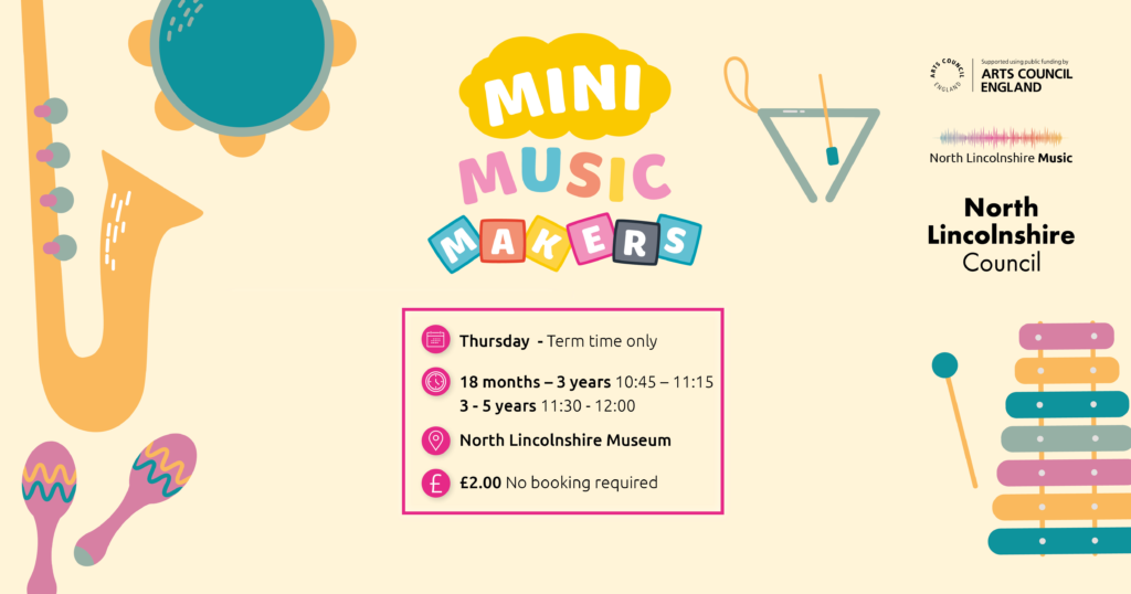 Mini Music Makers Explore sounds, instruments and voices through activities games and songs! Join North Lincolnshire Music every Thursday during term time. We will be running 2 classes: 18 months – 3 years class: 10:45 – 11:15am 3 – 5 years class: 11:30 – 12:00pm Come on a musical adventure… a new theme every week! No need to prebook, just turn up and pay at reception. £2 admits a child and their parent/guardian. Numbers are limited to 24 in total, so don’t be late.